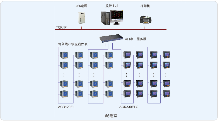 整個系統(tǒng)采用網(wǎng)絡分布式結構,監(jiān)控主機位于地下一層變電所值班室內,配電柜內安裝有本公司ACR330ELH、ACR120EL儀表共計60多回路。仁恒河濱花園電力監(jiān)控系統(tǒng)現(xiàn)場共1個低壓配電室,配電室內采用安科瑞ACR系列電力監(jiān)控儀表采集各回路的電流、電壓、電能等電參量,然后通過中間層采集設備網(wǎng)線到監(jiān)控室計算機上,實現(xiàn)遙測、遙信功能。