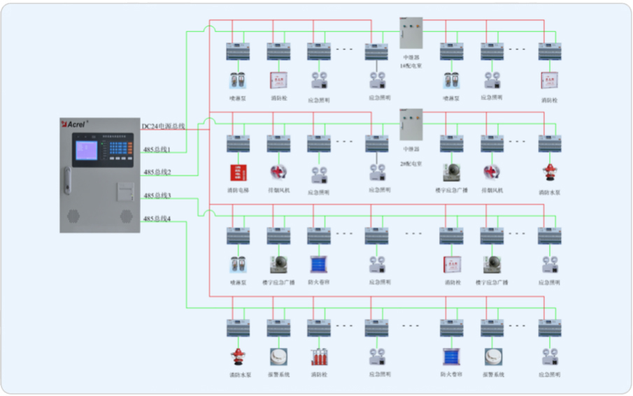系統(tǒng)組網(wǎng)共分為站控管理層、網(wǎng)絡(luò)通訊層、現(xiàn)場(chǎng)設(shè)備層三層,該項(xiàng)目通訊總線共接入9條通訊總線,總線在樓層配電箱手拉手串接后,接入消防設(shè)備電源中繼器,在接入壁掛式后臺(tái),組成消防設(shè)備電源監(jiān)控系統(tǒng)的大動(dòng)脈。AFPM100消防設(shè)備電源監(jiān)控系統(tǒng)能夠?qū)ο涝O(shè)備的電源進(jìn)行實(shí)時(shí)的監(jiān)控,通過檢測(cè)消防設(shè)備電源的電壓、電流、開關(guān)狀態(tài)等相關(guān)信息,從而判斷消防設(shè)備電源是否有斷路、短路、過壓、欠壓、缺相、錯(cuò)相以及過流(過載)等故障信息并報(bào)警、記錄。通過友好的人機(jī)交互界面,實(shí)時(shí)反映出被監(jiān)控設(shè)備電源的狀況,并集中顯示,從而有效避免在火災(zāi)發(fā)生時(shí)消防設(shè)備由于電源故障而無法正常工作的危急情況,保障消防聯(lián)動(dòng)系統(tǒng)的可靠性。該項(xiàng)目現(xiàn)場(chǎng)共有152只AFPM3-2AV消防設(shè)備電源探測(cè)器模塊。