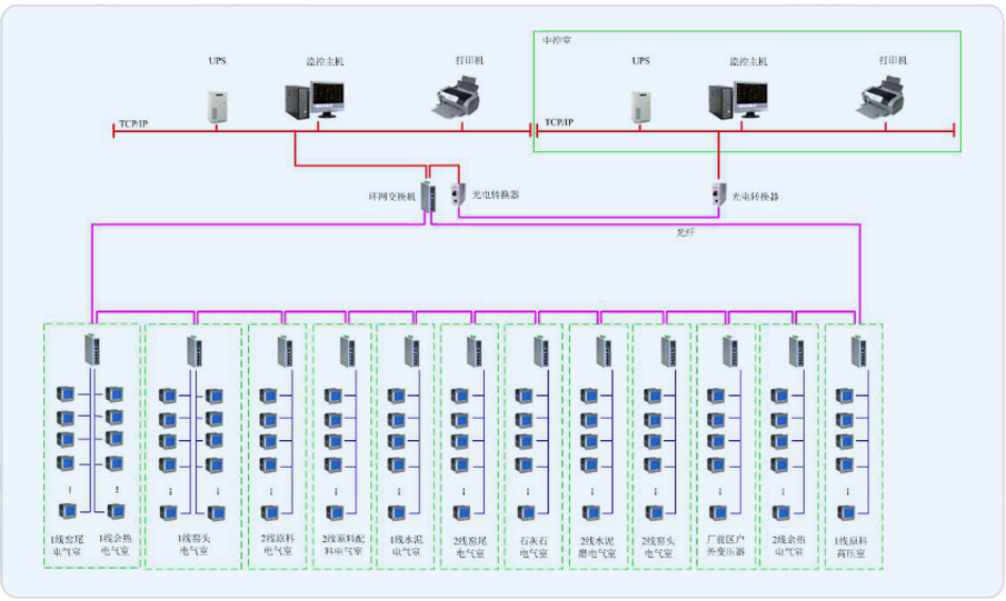 中材萍鄉水泥有限公司廠區重點用電回路分別分布于1線原料高壓室、1線窯尾電氣室、1線窯頭電器室、2線原料電器室、2線原料配料電氣室、1線水泥電氣室、2線窯尾電氣室、石灰石電氣室、2線水泥磨電氣室、2線窯頭電氣室、廠前區戶外變壓器、1線余熱電氣室以及2線余熱電氣室等共計13個電器室內。