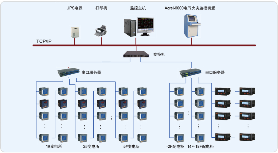本項目采用Acrel-6000電氣火災(zāi)監(jiān)控系統(tǒng),監(jiān)控范圍主要為處于地下室的低壓配電間和各個樓層中的配電柜。客戶系統(tǒng)需求為探測漏電電流、過電流、超溫度等信號,發(fā)出聲光信號報警,準(zhǔn)確報出故障線路地址,監(jiān)視故障點的變化。儲存各種故障和操作試驗信號,顯示系統(tǒng)電源狀態(tài)。