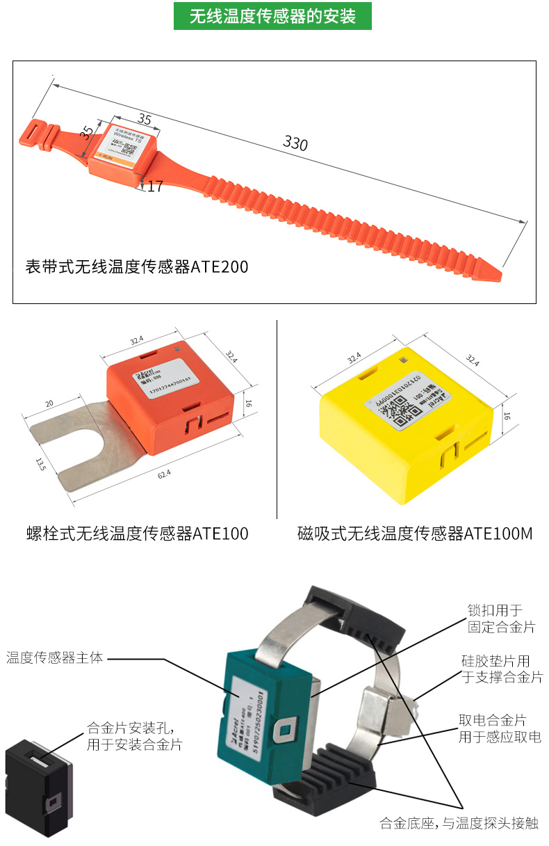 適用于高低壓開關(guān)柜內(nèi)電纜接頭、斷路器觸頭、刀閘開關(guān)、高壓電纜中間頭、干式變壓器、低壓大電流等設(shè)備的溫度監(jiān)測。