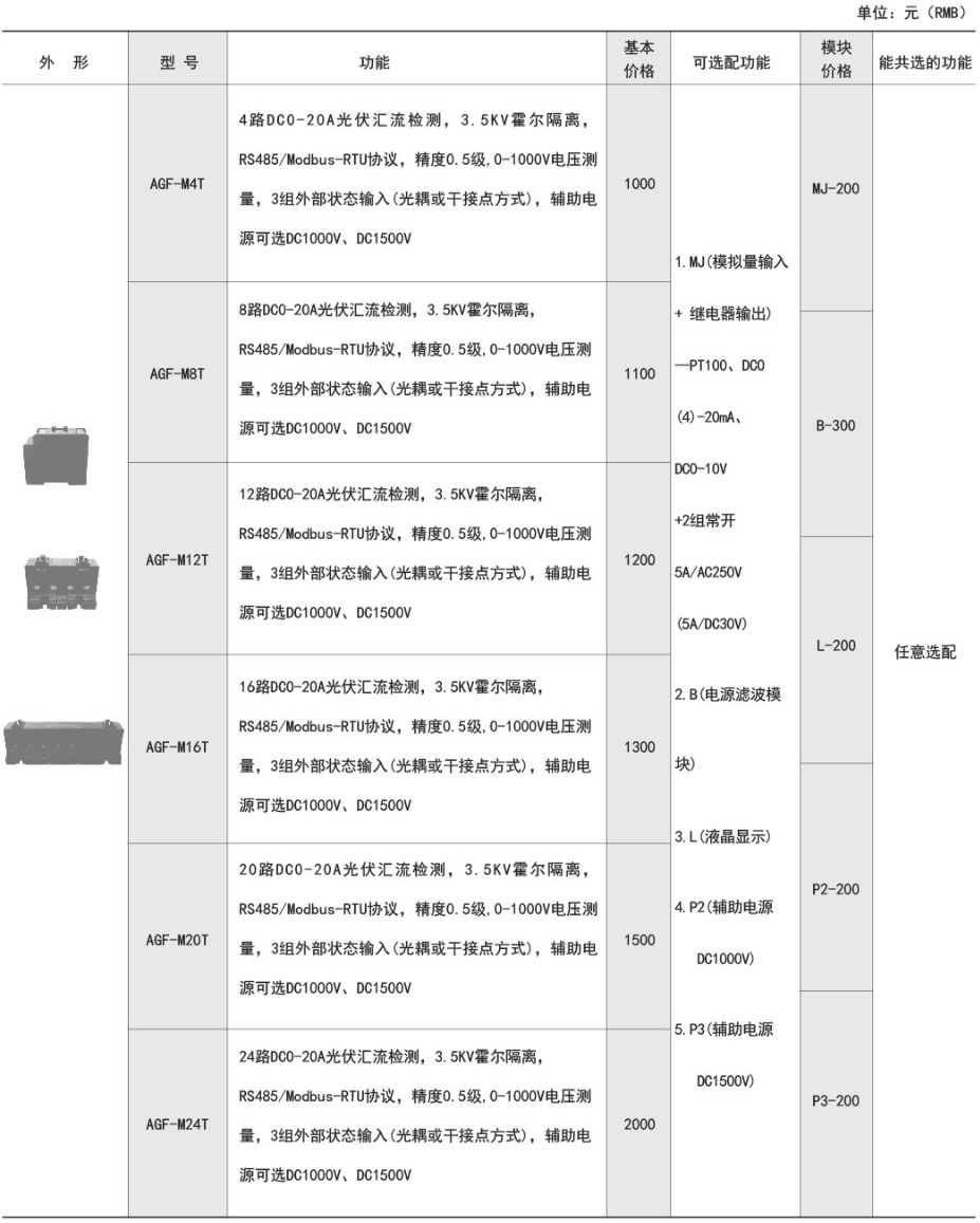 AGF-T穿孔式光伏匯流采集裝置是專門應用于智能光伏匯流箱,用于監測光電池陣列中電池板運行狀態,組串電流測量,匯流箱中防雷器狀態采集、直流斷路器狀態采集、裝置帶有RS485接口可以把測量和采集到的數據...