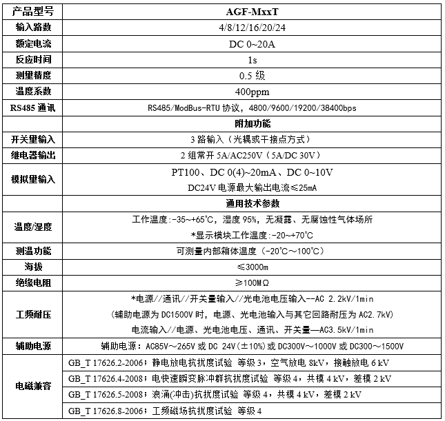 AGF-T穿孔式光伏匯流采集裝置是專門應用于智能光伏匯流箱,用于監測光電池陣列中電池板運行狀態,組串電流測量,匯流箱中防雷器狀態采集、直流斷路器狀態采集、裝置帶有RS485接口可以把測量和采集到的數據和設備狀態上傳。